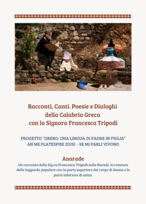 Una volta c’era… Un racconto inusuale di terre fatte di silenzio, montagne piene di luce, immobilità, tetti aperti sul cielo e finestre sul mare; un viaggio onirico fra paesaggi favolosi, personaggi leggendari e mitologici e castelli stregati accompagnati dal suono della antica lingua della Calabria Greca.