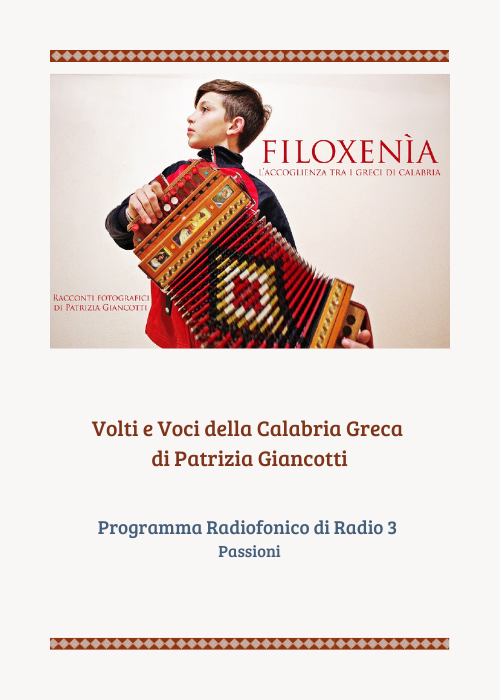 Volti e voci della Calabria Greca fa riferimento al libro di racconti fotografici di Patrizia Giancotti Filoxenìa – L’accoglienza nella Calabria Greca, edito da Rubbettino, nell’ambito della collana Parco Culturale della Calabria Greca ideata dal GAL Area Grecanica, che ha promosso questa ricerca.